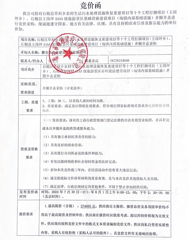石棉縣草科鄉(xiāng)農村生活污水處理設施恢復重建項目等十個工程打捆項目(王崗坪鄉(xiāng))、石棉縣王崗坪AAAA級旅游景區(qū)基礎設施建設項目(場鎮(zhèn)內部基礎設施)井圈井蓋采購競價公告
