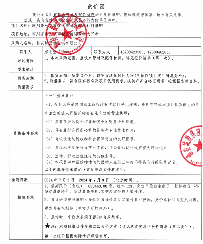 競價函--雅州壹號院直飲水管材及配件材料采購