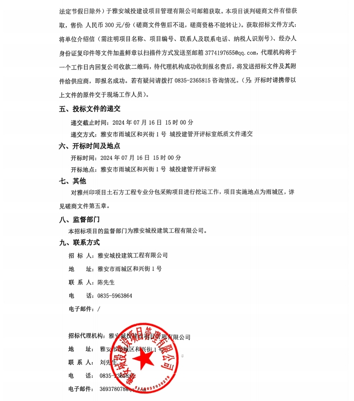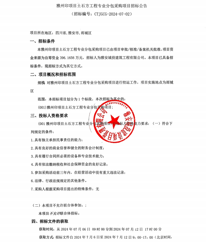雅州印項目土石工程專業(yè)分包采購項目招標公告