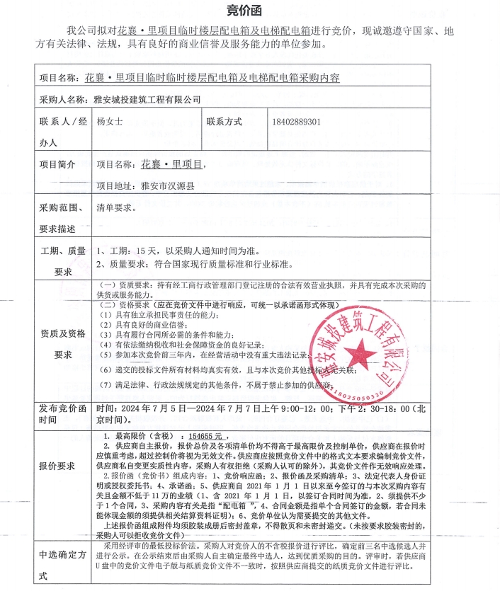 花襄·里項(xiàng)目臨時(shí)樓層配電箱及電梯配電箱競價(jià)公告