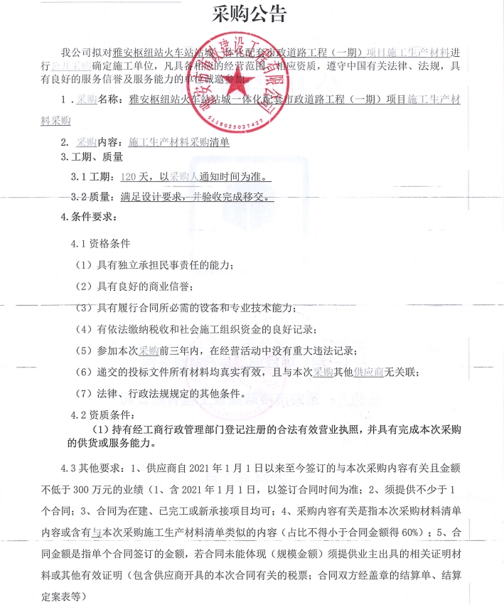 雅安樞紐站火車站站城一體化配套市政道路工程(一期)項目施工生產(chǎn)材料采購公告