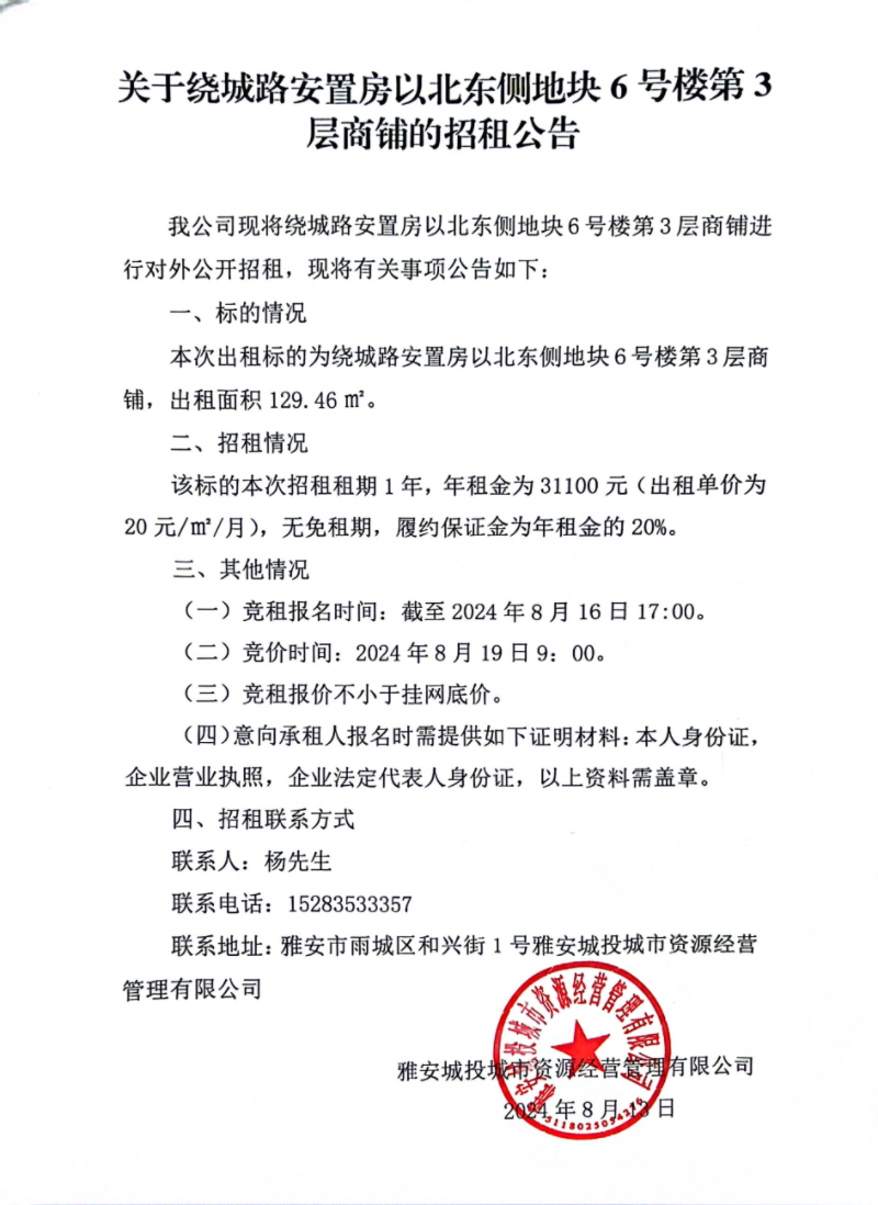關(guān)于繞城路安置房以北東側(cè)地塊6號(hào)樓第3層商鋪的招租公告