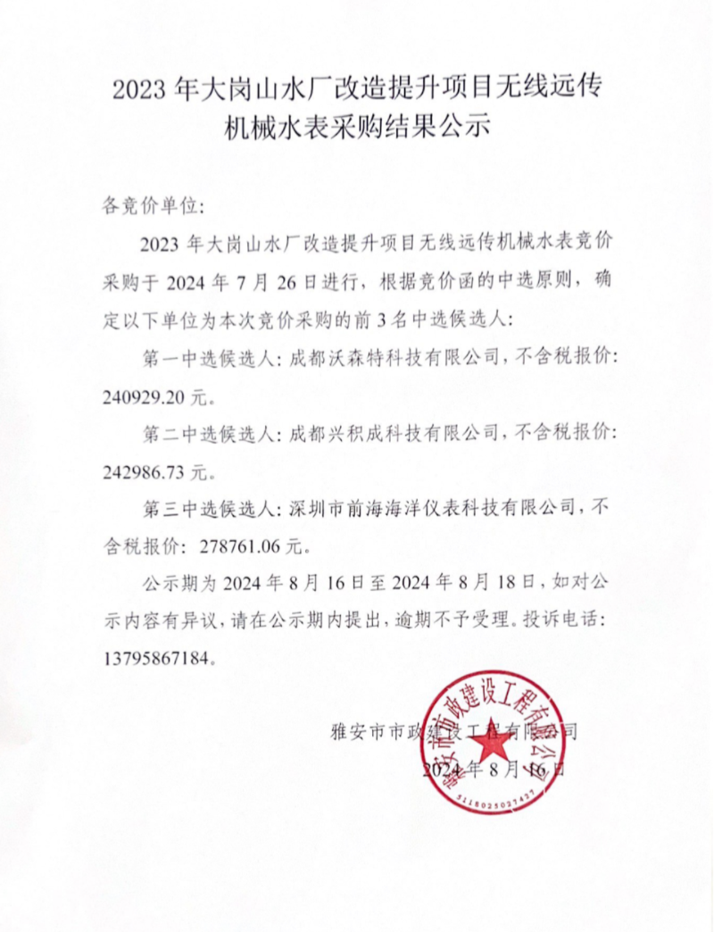 2023年大崗山水廠改造提升項(xiàng)目無線遠(yuǎn)傳機(jī)械水表采購結(jié)果公示