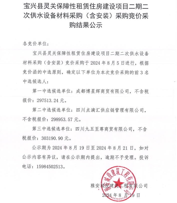 寶興縣靈關(guān)保障性租賃住房建設(shè)項(xiàng)目二期二次供水設(shè)備采購(含安裝)采購競價(jià)采購結(jié)果公示