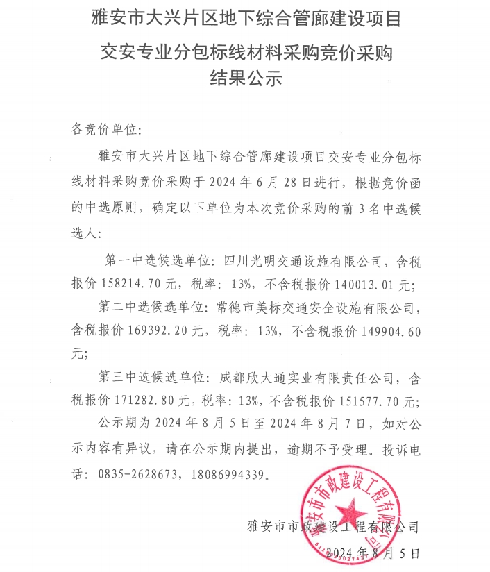 雅安市大興片區(qū)地下綜合管廊建設項目道路專業(yè)分包標線材料采購競價采購結(jié)果公示