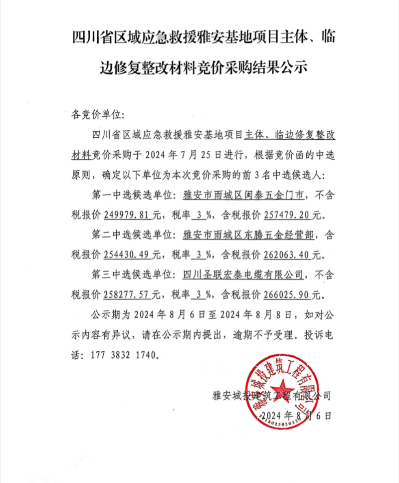 四川省區(qū)域應(yīng)急救援雅安基地項(xiàng)目主體、臨邊修復(fù)整改材料競(jìng)價(jià)采購(gòu)結(jié)果公示
