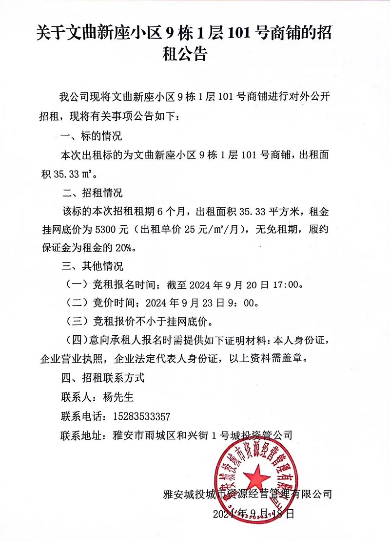 關于文曲新座小區(qū)9棟1層101號商鋪的招租公告
