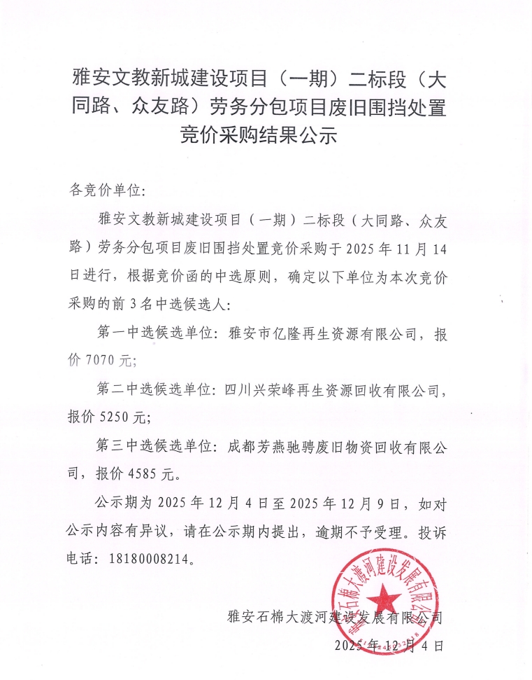 雅安文教新城建設(shè)項(xiàng)目(一期)二標(biāo)段(大同路、眾友路)勞務(wù)分包項(xiàng)目廢舊圍擋處置競(jìng)價(jià)采購(gòu)結(jié)果公示