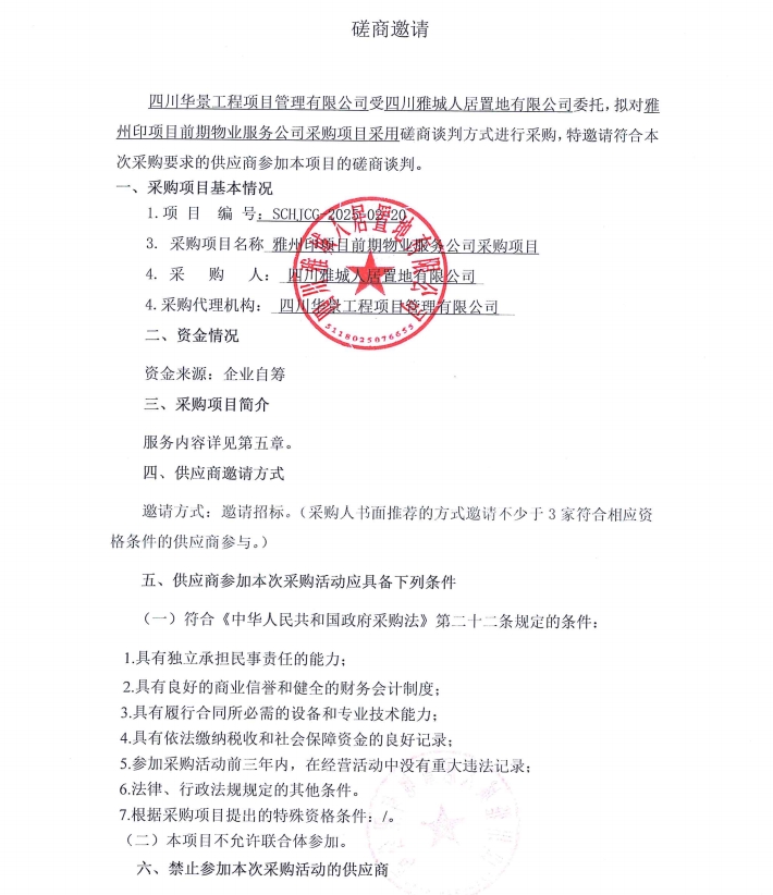 雅州印項目前期物業(yè)服務公司采購項目磋商邀請