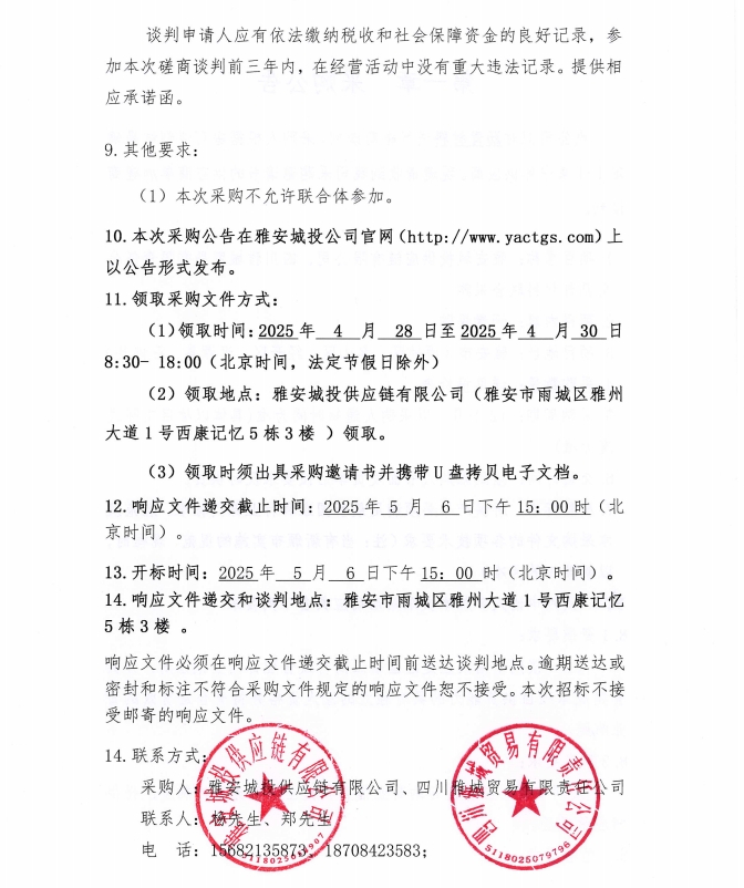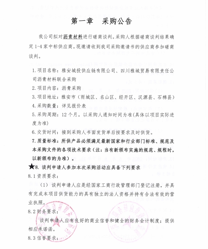 雅安城投供應鏈有限公司、四川雅城貿易有限責任公司瀝青材料聯合采購公告