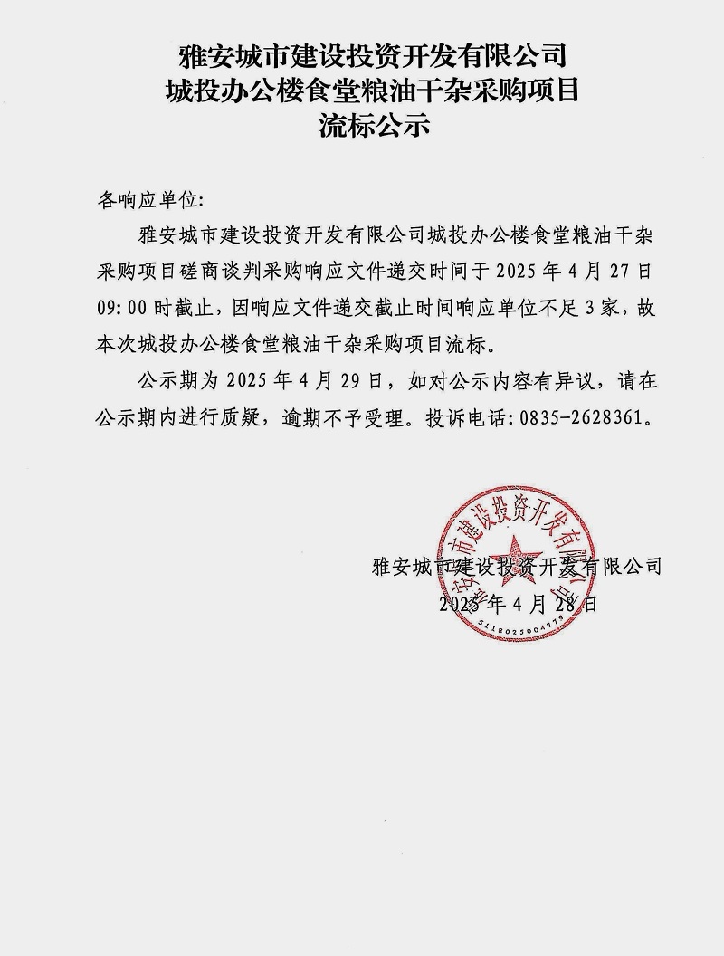 雅安城市建設(shè)投資開發(fā)有限公司辦公樓食堂干雜采購項(xiàng)目流標(biāo)公示