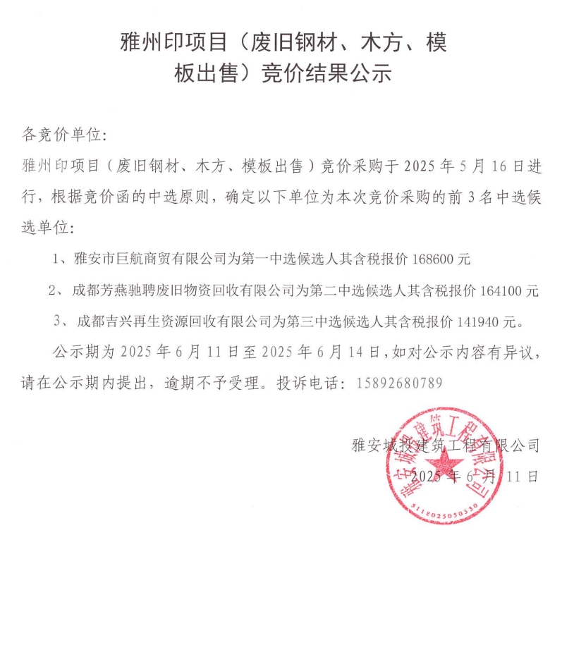 雅州印項(xiàng)目(廢舊鋼材、木方、模版出售)競(jìng)價(jià)結(jié)果公示