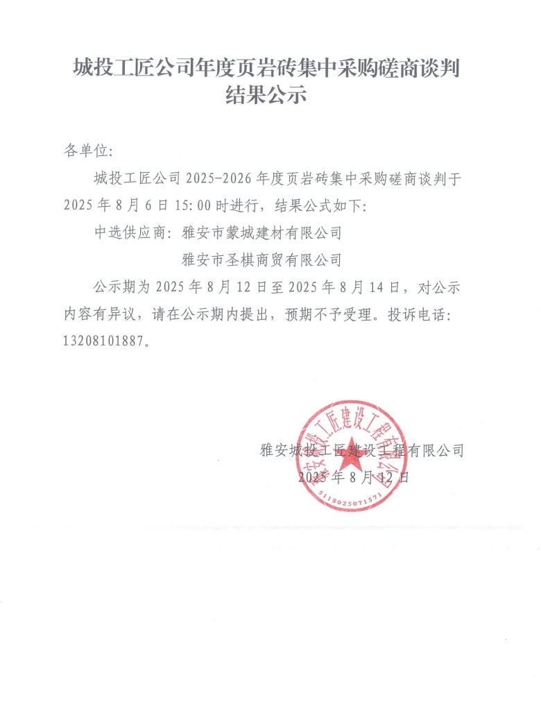 城投工匠年度頁巖磚集中采購磋商談判結(jié)果公示