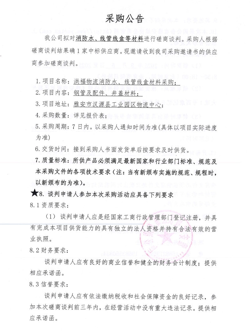 洪福物流消防水、線管線盒等材料采購(gòu)公告