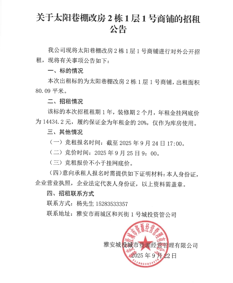 關(guān)于太陽巷棚改房2棟1層1號商鋪的招租公告