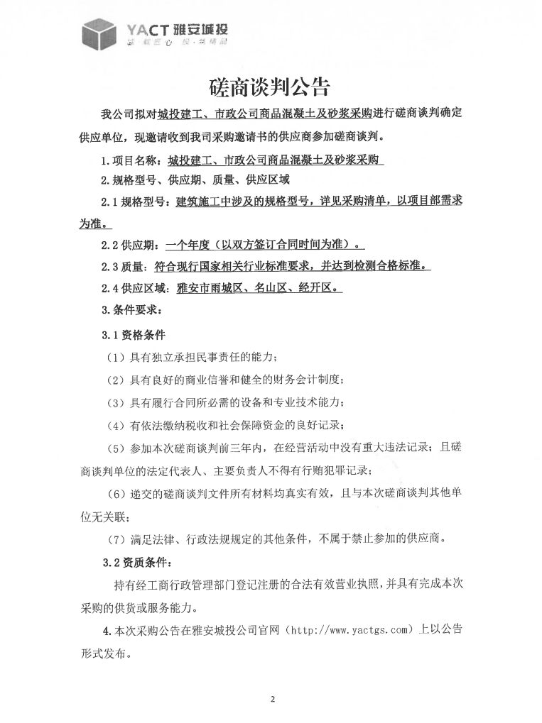 城投建工、市政公司商品混凝土及砂漿采購磋商談判公告