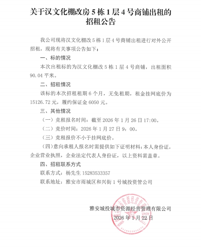 關(guān)于漢文化棚改房5棟1層4號(hào)商鋪出租的招租公告