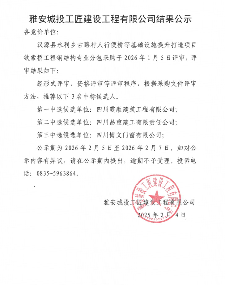 漢源縣永利鄉(xiāng)古路村人行便橋等基礎(chǔ)設(shè)施提升打造項目鐵索橋工程鋼結(jié)構(gòu)專業(yè)分包采購結(jié)果公示