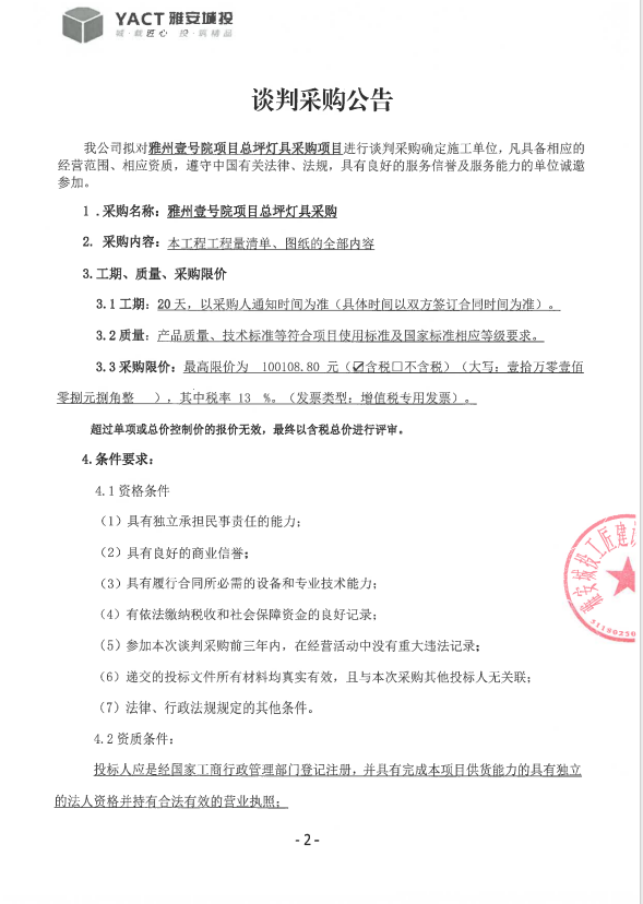 雅州壹號(hào)院總坪燈具談判采購(gòu)文件