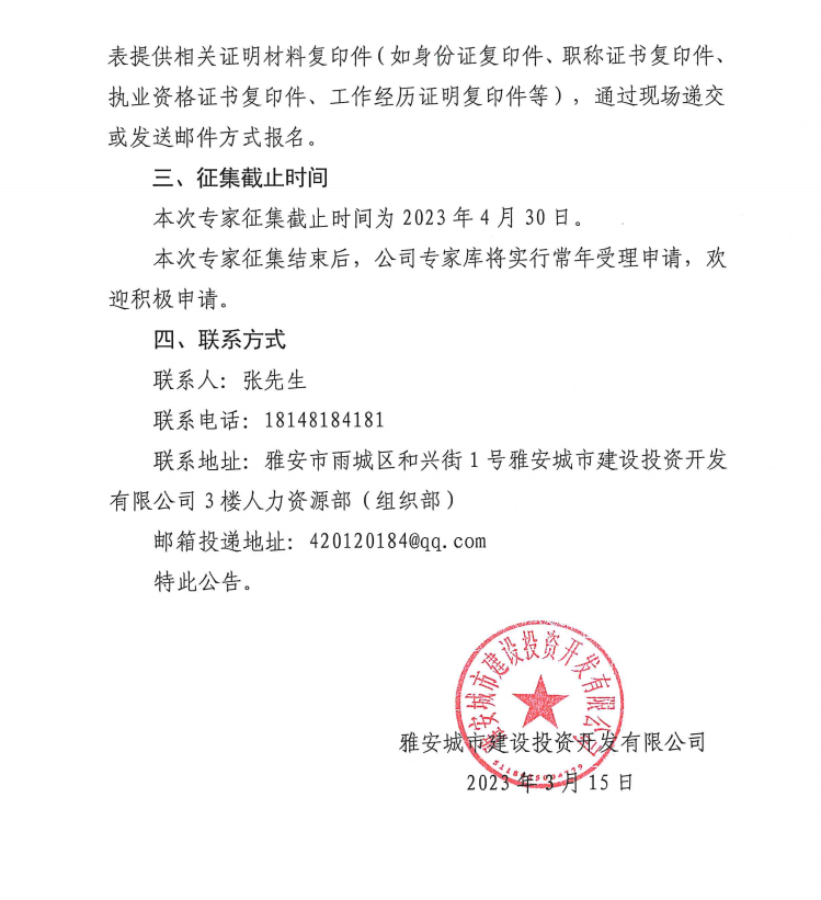 雅安城市建設投資開發(fā)有限公司關于征集入庫專家的公告