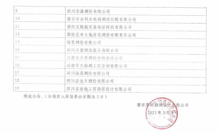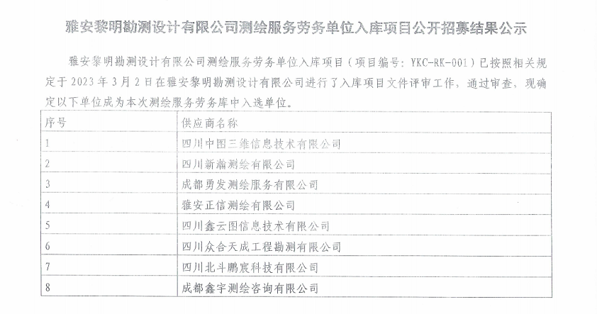 雅安黎明勘測設(shè)計(jì)有限公司測繪服務(wù)勞務(wù)單位入庫項(xiàng)目公開招募結(jié)果公示