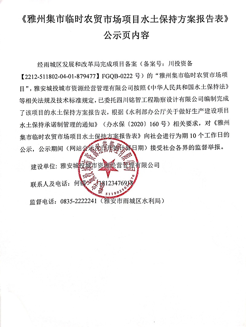《雅州集市臨時(shí)農(nóng)貿(mào)市場項(xiàng)目水土保持方案報(bào)告表》公示